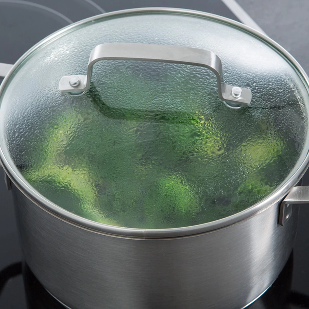 De gesatineerde roestvrij edelstalen body loopt loodrecht omhoog en mondt uit in een strakke rand. Door deze schenkrand kun je eenvoudig vloeistoffen afgieten. De strak afgeronde grepen en stelen zijn vuurvast, liggen prettig in de hand en zorgen voor een veilige grip tijdens het koken.