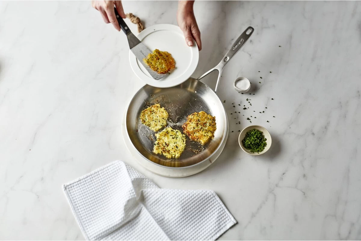 Pannenkoeken, crêpes, flensjes … hoe je ze ook noemt, ze zijn onweerstaanbaar. Zeker als je ze in de ruime Industry 5 pannenkoekenpan van 26 cm klaarmaakt. Hiermee tover je moeiteloos mooie egale pannenkoeken met een heerlijk krokant randje op ieders bord. Het solide 5-lagenmateriaal verdeelt de warmte goed zodat je gelijkmatig en gecontroleerd kunt bakken. Het kwalitatieve roestvrije staal zorgt in combinatie met margarine of (room)boter voor heerlijk krokante randjes. Dankzij de lage, schuine rand draai je de pannenkoeken makkelijk om en glijden ze zonder problemen de pan uit. Voor je het weet heb je dus een grote stapel lekkers klaar als dessert, vieruurtje, voor een kinderfeestje, als lunch of avondmaal. Want naast tal van zoete recepten – met siroop, suiker, honing, bosbessencompote, chocolade … – zijn er ook veel heerlijk hartige combi’s. Wat denk je bijvoorbeeld van pannenkoeken met spinazie en brie, of met krokante spekjes, bieslook en champignons. Hou je van crêpe suzette of van flensjes met gekaramelliseerde appeltjes? Ook die slagen gegarandeerd in de Industry 5 pannenkoekenpan. Flamberen? Doe gerust. Dankzij de speciale Silvinox® technologie verkleurt de pan niet en krijg je ze telkens in een handomdraai weer schoon. Gebruik je wel eens een mes of vork in een pan? Geen stress, dit exemplaar kan ertegen. Nog een voordeel: de stijlvolle roestvrijstalen steel met gezandstraald oppervlak blijft lang koel. Deze slimme en robuuste vormgeving in Amerikaanse industriële stijl, door de Belgische designer Stefan Schöning, blijft je voldoening geven.