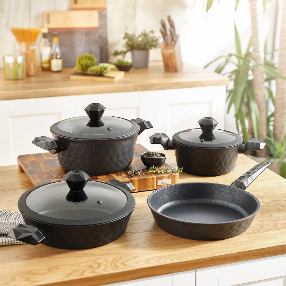 Karaca Bio Diamond Antibacteriële Handgreep 7 Delige PannensetInhoud20 cm pot: 2,5 liter24 cm pot: 4,5 liter26 cm pot: 3,5 liter26 cm panKenmerken Het is ontwikkeld met Antibacteriële Zilver Nano-Tech Handvat technologie. met zilveren nanodeeltjes gecoate handgrepen hebben de eigenschap jarenlang antibacterieel te zijn. Het zorgt voor een comfortabel en zorgeloos gebruik tijdens het koken. Gemaakt van echte diamantkristallen, het meest duurzame wonder van de natuur. Het heeft een superieur onbrandbaar antiaanbaklaag. Het biedt ultraduurzaamheid. Vetvrije eieren kunnen worden gekookt. Groenten kunnen gekookt worden zonder olie. Het kan op alle kookplaten worden gebruikt, ook inductie. Het kan in de vaatwasser worden gewassen.