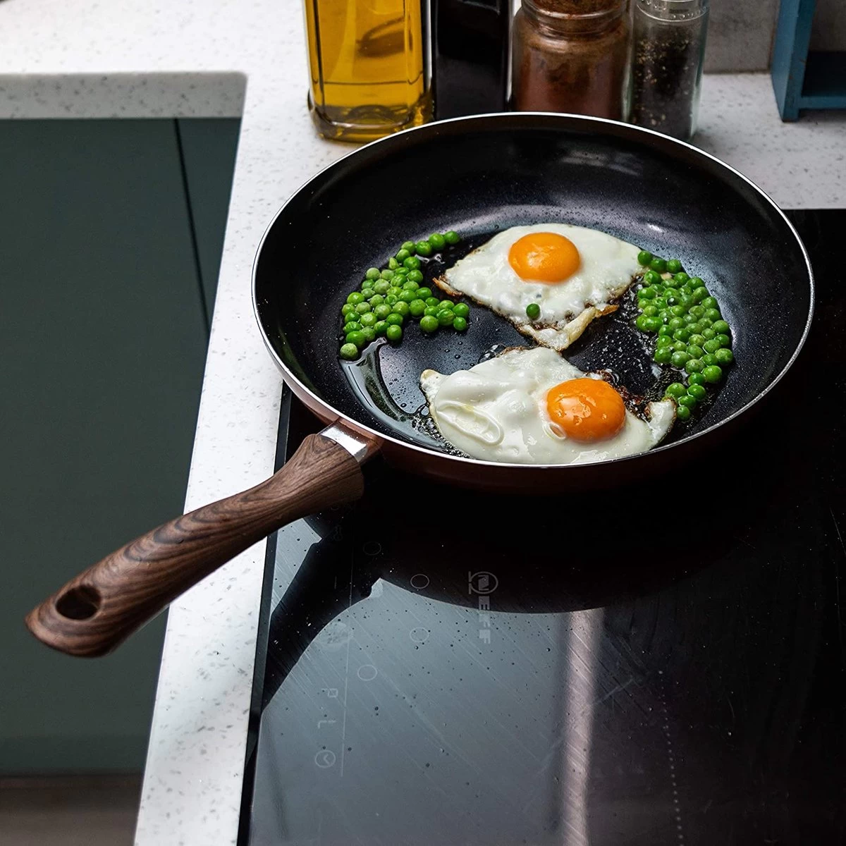 Onze koekenpannenset voor koekenpannen bevat een pan van 24 cm. Een perfecte essentiële pan om een ​​breed scala aan gerechten te bakken en sauteren, van eenvoudige roereieren tot een volledige dinermaaltijd. Deze koekenpan met antiaanbaklaag wordt uw favoriete kookset in de keuken!