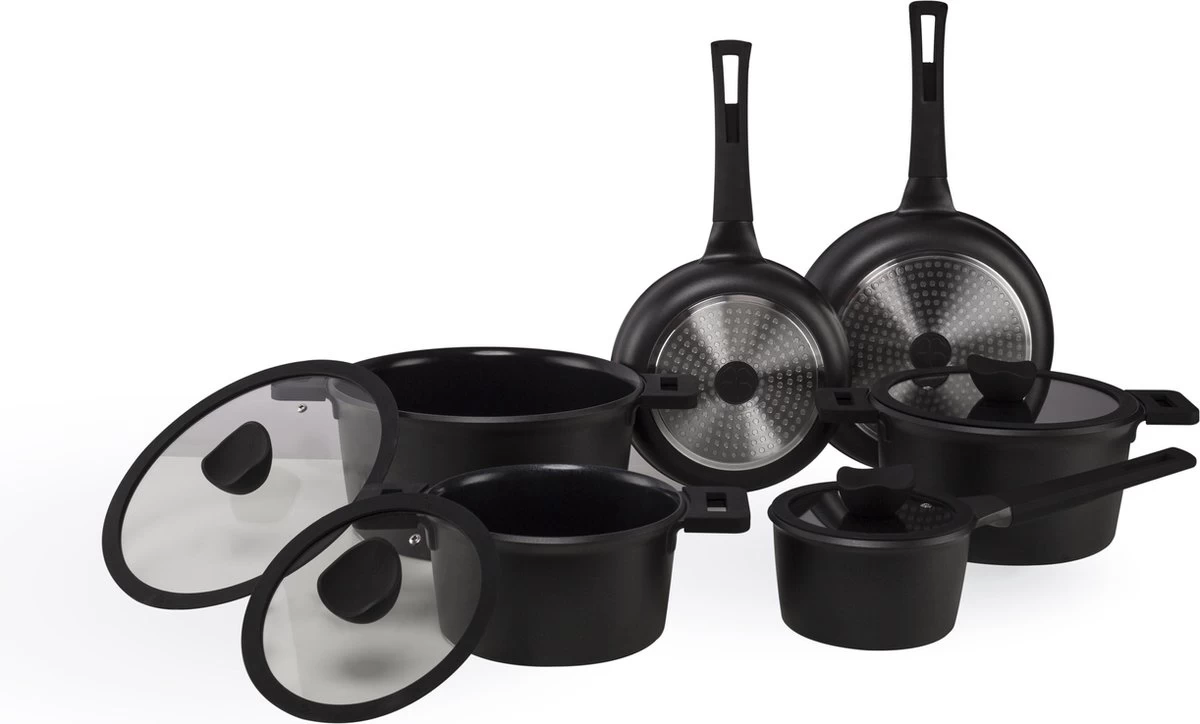 De complete set bestaat uit 6 kwaliteitspannen met koudgrepen, 4 gehard glazen deksels en 4 luxe opbergbakjes. De pannen zijn geschikt voor elke warmtebron.