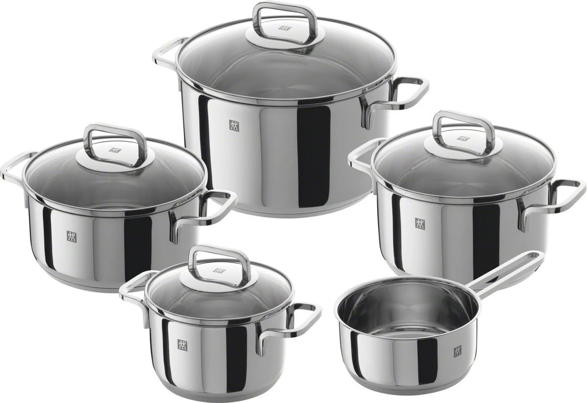 De vijfdelige ZWILLING Quadro kookpannenset bestaat uit drie hoge kookpannen met een diameter van 16, 20 en 24 cm, een grote kookpan van 20 cm en een steelpan van 16 cm. Behalve de steelpan beschikken alle kookpannen over een goed aansluitend, glazen deksel op maat.